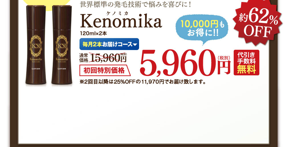 初めてご注文の方は…初回限定特別価格でお試し頂けます! 世界で認められた技術をご実感ください。初めての方限定特別キャンペーン!世界標準の育毛技術で悩みを喜びに!Kenomikaケノミカ