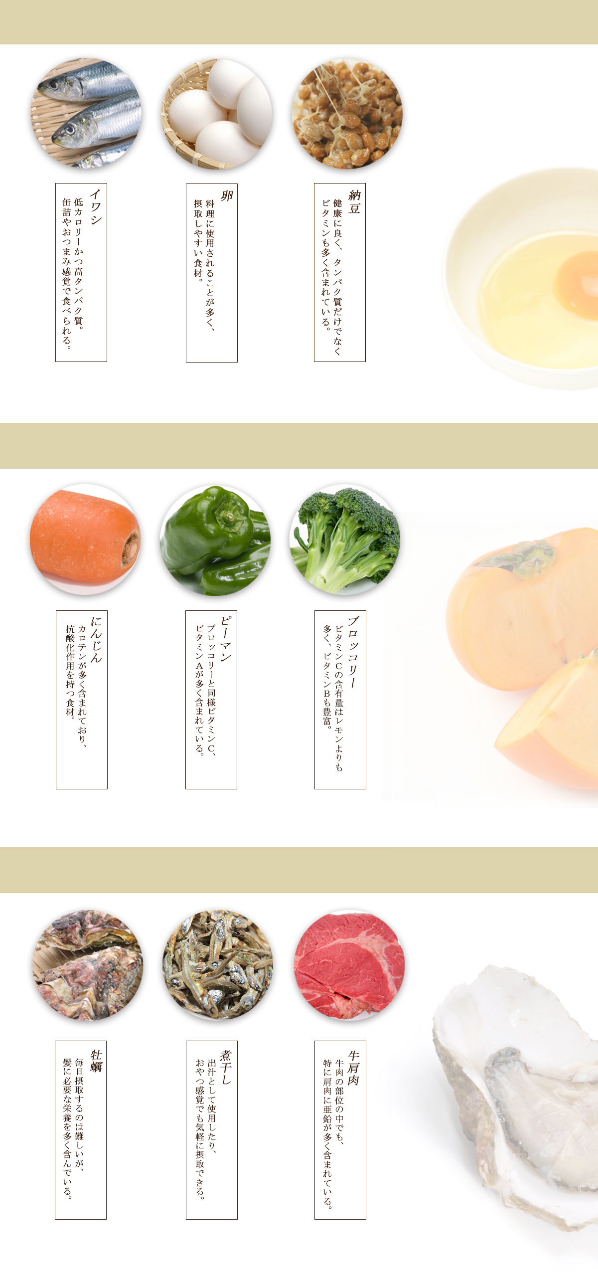 ビタミンには、疲労・ストレス回復効果や血流改善などの作用があります。特にビタミンB群は、髪を作る毛母細胞を活発化させる働きがあるとされ、